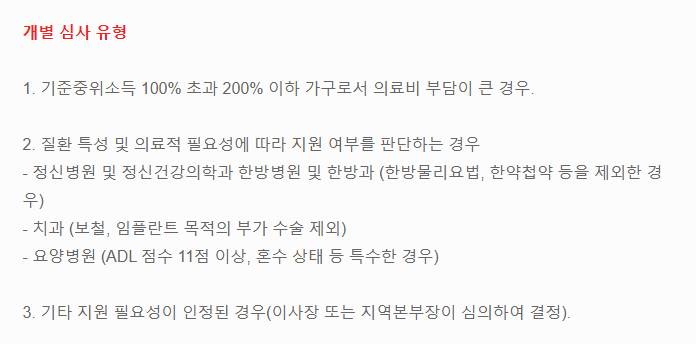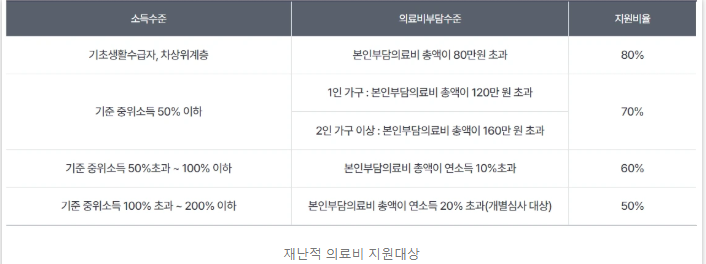 - ✅ 지원 대상: 중증질환, 희귀질환, 기준 중위소득 100% 이하 가구 등